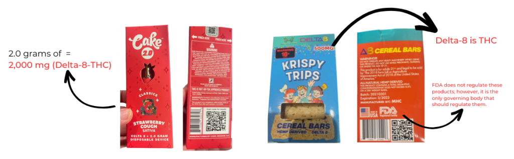 Today’s hemp products are intentionally designed to resemble everyday foods, like candies, to target children. Sugary flavors are added to vapes and other THC products to conceal their toxic taste.