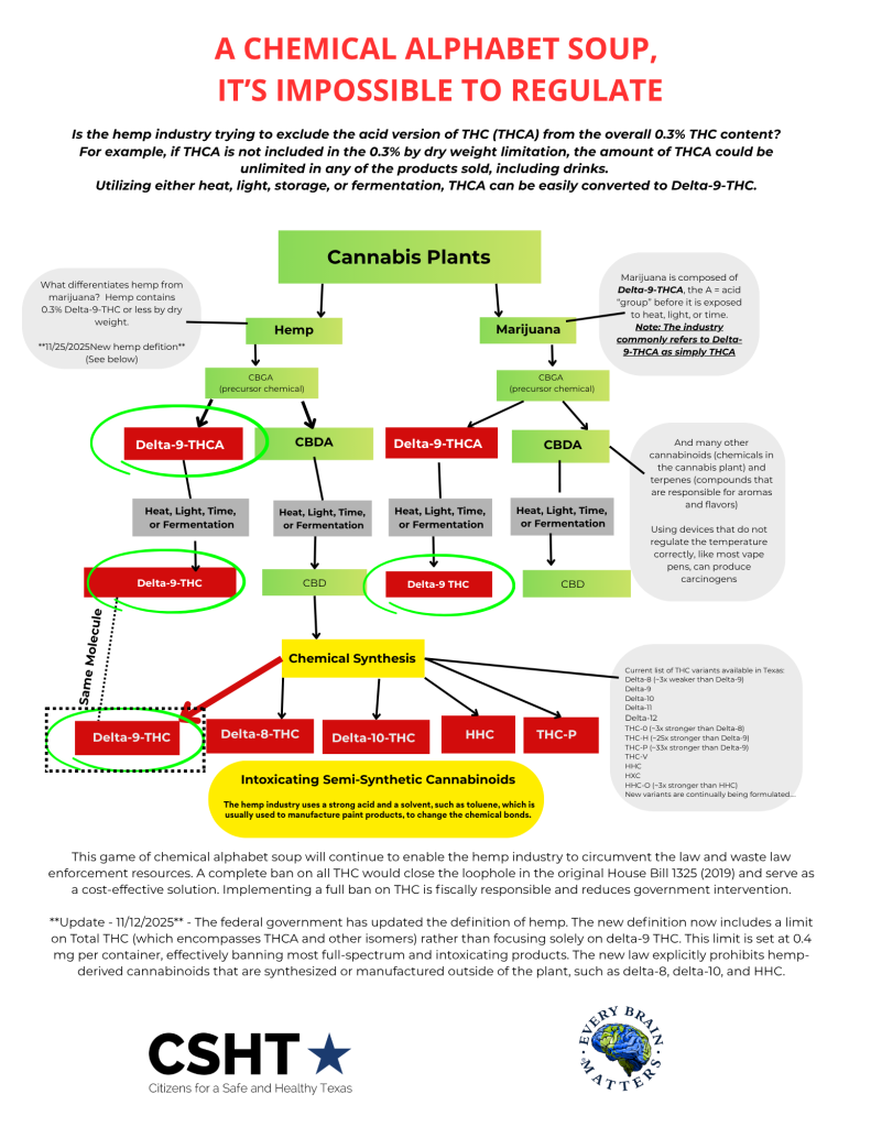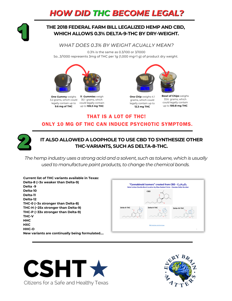 Vape and smoke shops, gas stations, and various retailers are selling hemp-derived THC and its analogues, such as Delta-8-THC, which are synthetically produced from CBD. These products are being marketed as medicine and are being sold to Texas youth, contributing to severe mental and physical health issues and, in some cases, even death.